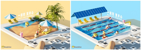 创意思想: 以当代Z世代群体较为喜欢方式作为出发点,以微信聊天界面为主要设计对象,融入了游泳池,将卜吉熊家族成员融入画面中,再现欢快的场面,再现卜吉熊家族与目标人群的密切关系。