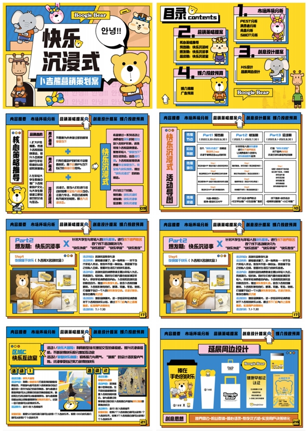创意思想: 希望通过一系列活动让消费者在快乐时能挂勾到卜吉熊IP形象,进而衔接卜吉熊品牌理念,聚焦年轻人“享受当下”的生活观念,结合流行词,卜吉熊能够提供消费者专注享受当下,完全投入快乐场景,提出“快乐沉浸式”的核心概念。