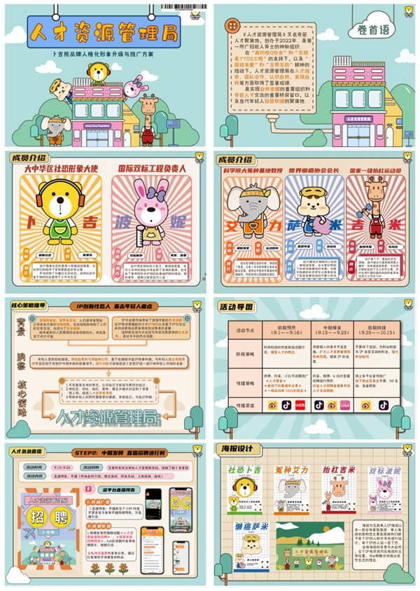 创意思想: 经洞察发现,z世代年轻人普遍具有社恐、双标等五大性格特征,我们将这些特征与卜吉家族ip的特点结合起来。打造出大中华区社恐形象大使等潮流人设,进一步提出人才资源管理局的概念。在吸引z世代参与互动的同时,加深与IP的感情联系。