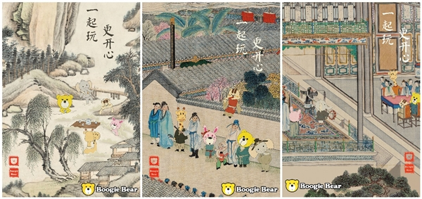 创意思想: 将卜吉熊家族融合到古画中,凸显卜吉熊家族有一定历史,且融合性很好的特点。用古代生活的方式打开卜吉熊的生活,比较创新。