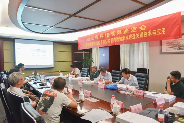 由浙江省工程勘察设计大师、浙江省建筑设计研究院副院长杨学林教授级高级工程师,天尚设计集团总建筑师牛寿雁教授级高级建筑师,浙江省现代建筑设计研究院总工程师陆少连教授级高级工程师,汉嘉设计集团建筑工业化咨询所副所长章宏东教授级高级工程师,杭州高德绿建智能科技有限公司总工程师黄振华高级工程师共5位专家组成鉴定委员会,对《可循环快装式自约束钢结构室内场馆集成建造关键技术与应用》项目进行科技成果鉴定。