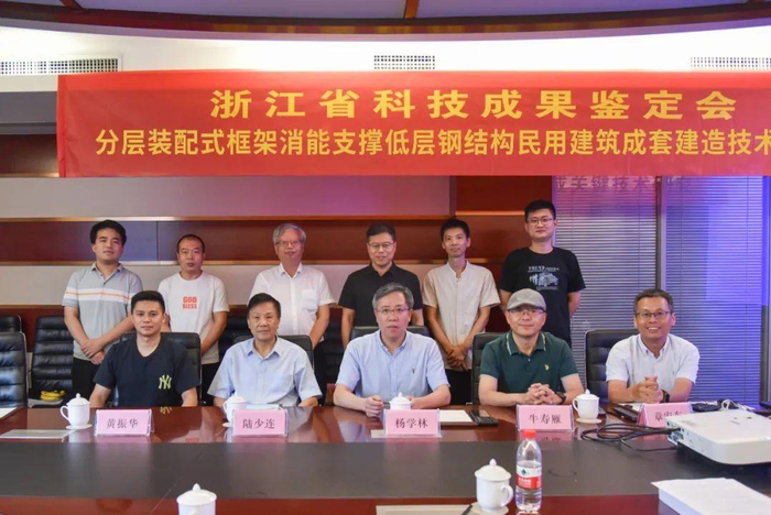 由浙江省工程勘察设计大师、浙江省建筑设计研究院副院长杨学林教授级高级工程师,天尚设计集团总建筑师牛寿雁教授级高级建筑师,浙江省现代建筑设计研究院总工程师陆少连教授级高级工程师,汉嘉设计集团建筑工业化咨询所副所长章宏东教授级高级工程师,杭州高德绿建智能科技有限公司总工程师黄振华高级工程师共5位专家组成鉴定委员会,对《分层装配式框架消能支撑低层钢结构民用建筑成套建造技术》项目进行科技成果鉴定。