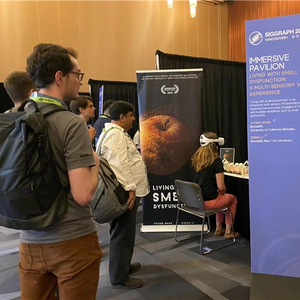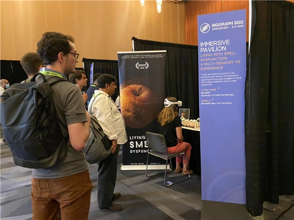 BroadAR公司创始人王雨婷,她所创作的具有多感官体验的VR影片 《体验嗅觉紊乱患者的一天》 通过层层筛选,被ACM协会选中发表,并且获得在SIGGRAPH上展示的机会。该作品在温哥华会议中心引起了众多现场观众的兴趣,人们在展台前排起了长龙。加州大学伯克利分校校友王雨婷将气味引入VR影片,挑战了观众对嗅觉的认知。她设计了一款能与VR设备互联的气味发散装置,通过控制该装置,她让观众闻到与场景所不匹配的气味,从而模拟出一个嗅觉功能紊乱者眼中的世界。“嗅觉紊乱是一种无形的疾病,但它通常会给病人的生活带来极大的不便和潜在的危险。而这种困扰对于没有这个疾病的人来说,是无法感同身受的”,她解释道,“由于VR可以让观众从第一视角去沉浸式体验,无疑就成为了最好的媒介,观众通过闻到减弱后的气味,不匹配的气味,甚至在大火中闻不到气味,来亲身体验嗅觉减弱,嗅觉紊乱和嗅觉丧失这三种不同的遭遇。