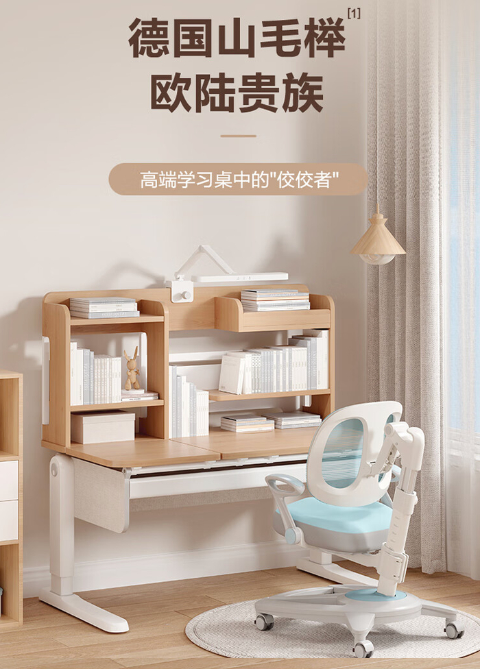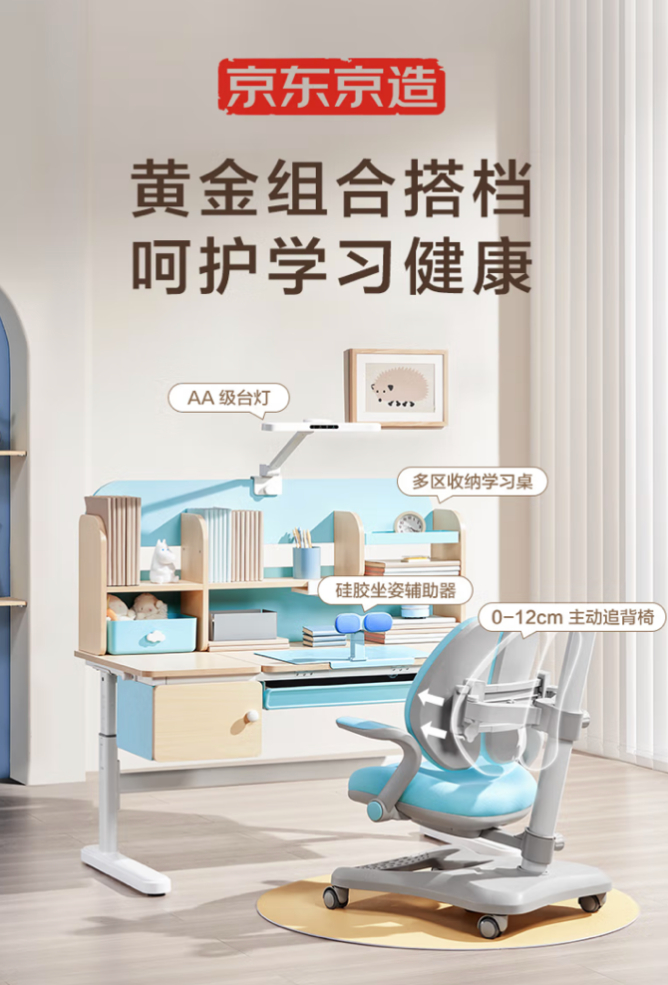 在儿童健康成长过程中,可能面临坐姿不良、用眼过度等带来的视力健康、脊柱健康问题。基于这些洞察,京东京造严苛产品品质、把控细节,打造了更高品质的榉木儿童学习桌椅,以德国双A榉木为原料,120道工艺精工打造,高F4检测标准,近0甲醛更环保;两档13cm的主动追背科技椅,更贴合儿童身形、呵护脊柱健康。充分呵护儿童健康。超大桌面、科学分区收纳、0-45°桌面版调节设计,能够打造沉浸式学习环境。“开学季”活动期间,这套儿童学习桌椅活动到手价仅需3899元,前50名还赠送AA级护眼台灯。