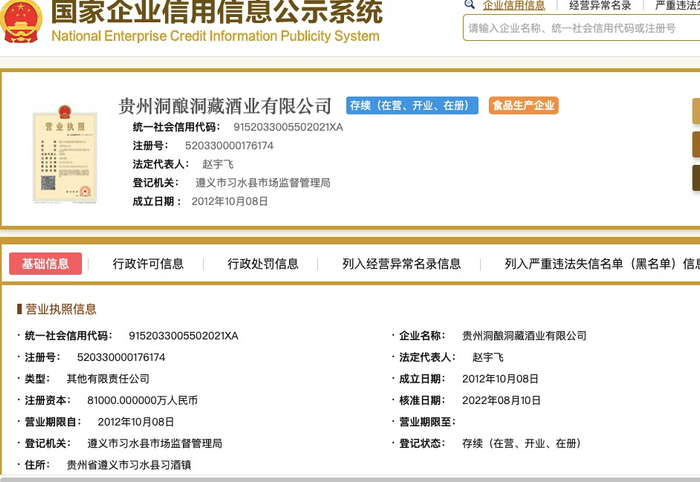 据国家企业信用信息公示系统消息,8月14日,贵州洞酿洞藏酒业有限公司工商登记信息变更,其注册资本由6.1亿元提升至8.1亿元。