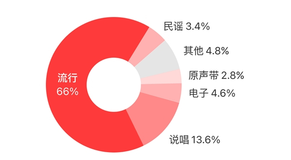 报告发现,流行和说唱是今年上半年听众最喜爱的音乐风格,两者歌曲之和占榜单数量的近八成。其中,说唱无愧近年的流量之王,占据13.6%,排行第二,且有着上升的趋势。电子、 原声带、民谣、摇滚等风格也都占据着一定的比例。