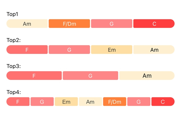 在上半年的榜单歌曲副歌中,最为热门的和弦进行是6451/6251,在副歌中使用过这一进行的歌曲其占比达到了25%,而紧随其后的4536和456和弦进行则分别占据了17%和16.2%。