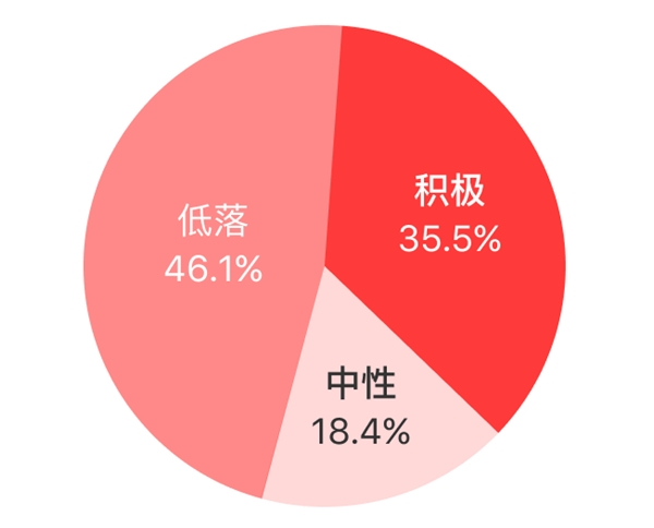 报告还分析了榜单歌曲的歌词情绪分布情况。其中低落情绪包含有伤感、孤独、懊恼等情绪,积极情绪包含快乐、幸福、温暖、轻松等,而中性情绪则处于既不积极也不低落的状态,例如平静,哲思,常出现于一些人生感悟类的歌曲。