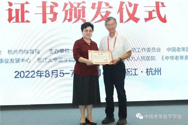 中国老年医学学会会长范利教授给中国老年医学学会运动健康分会名誉会长励建安教授颁发证书