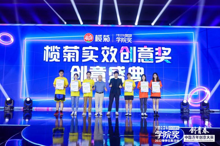 在创意盛典现场,榄菊日化集团市场部总经理陈绍洪先生、赞意互动广告有限公司合伙人&执行创意总监沈旦扬先生一同为获奖学生颁奖。