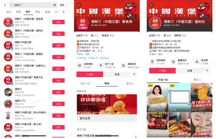 账号运营: 塔斯汀在抖音运营多个矩阵账号,并于从今年4月开始进入快速涨粉期,目前“塔斯汀(中国汉堡)美食局”、“塔斯汀(中国汉堡)福利社”粉丝量30w左右,其中定期的常态化直播成为粉丝增长的重要来源。