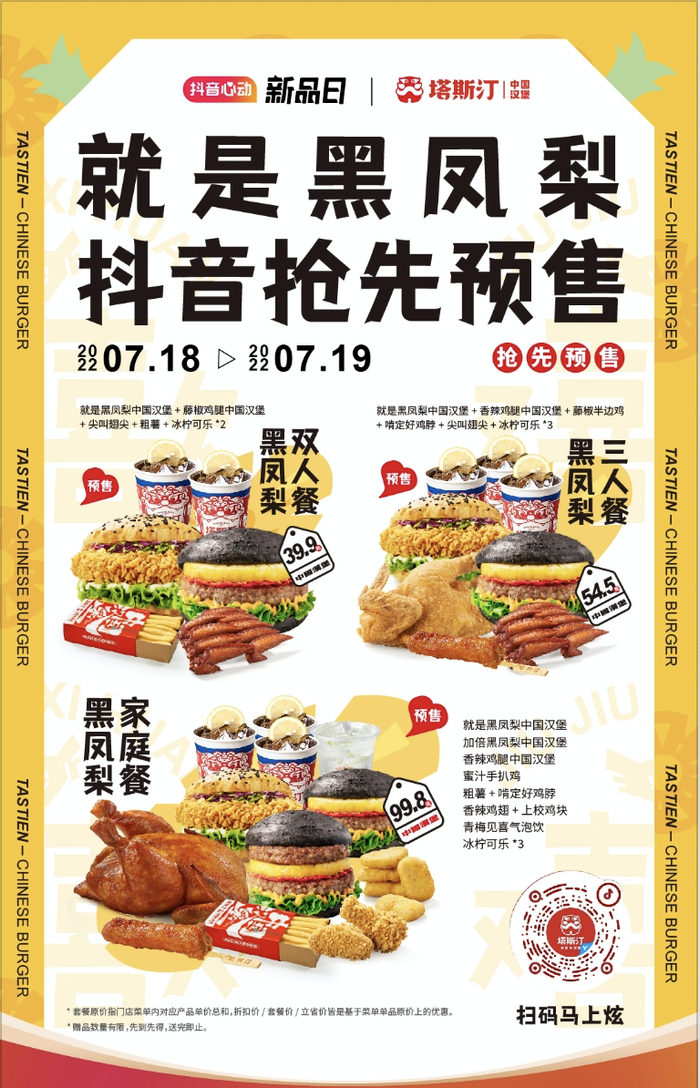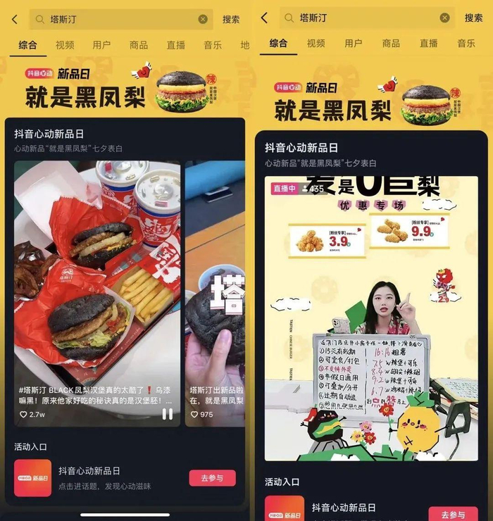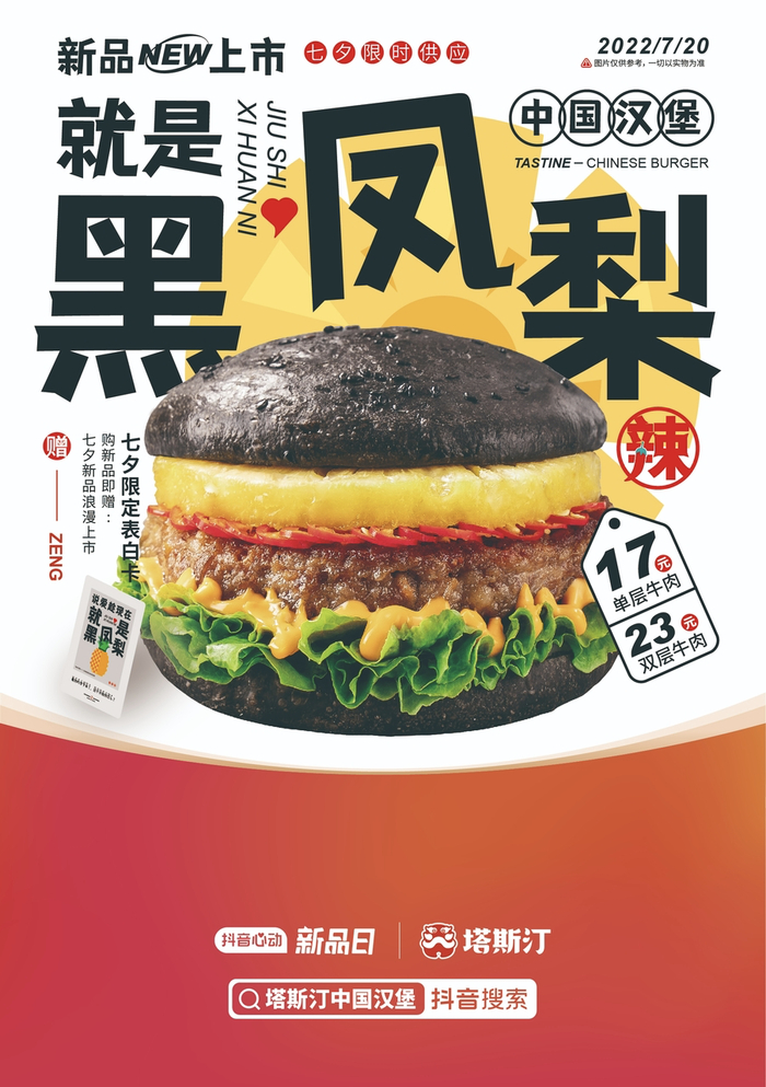 在刚过去的七夕情人节,大多数品牌还在用传统双人套餐吸客时,塔斯汀把目光投向了拥有6亿日活用户的抖音平台,联合抖音生活服务IP活动“抖音心动新品日”,推出七夕新品“就是黑凤梨中国汉堡”,成为餐饮七夕营销的一匹黑马!