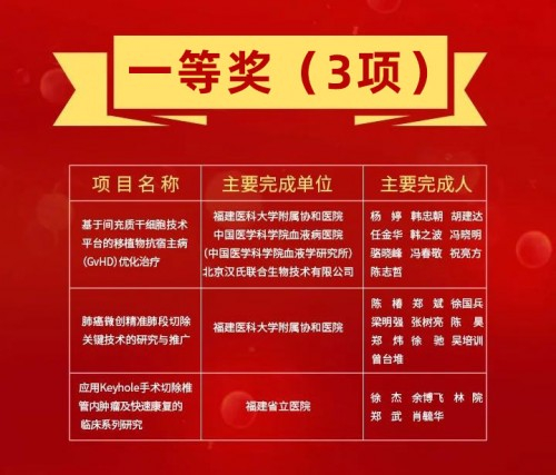 由福建医科大学附属协和医院、中国医学科学院血液病医院、北京汉氏联合生物技术有限公司共同合作完成的项目“基于间充质干细胞技术平台的移植物抗宿主病(GvHD)优化治疗”荣获“2021年福建省医学科技奖一等奖”。
