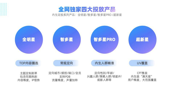该系列包括多种产品,如绑定TOP热剧的全明星、智能选剧提高TA浓度的智多星、基于阿里大数据聚合人群标签的智多星PRO、规定时间周期内最大范围UV覆盖的超新星等,以多元的解决方案实现广告主的各种推广目标。