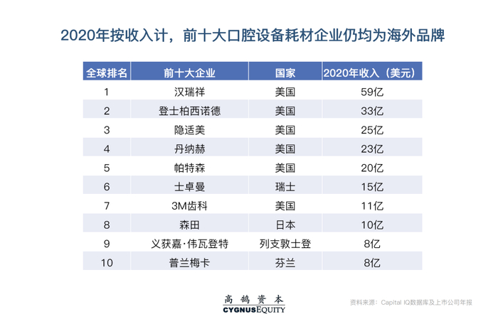 三是延展力强。口腔上游的器械、耗材、设备作为标准化程度更高的领域,其延展力更强,同时口腔上游产品能够开拓到全球市场,并形成规模化效应。例如登士柏西诺德、丹纳赫、士卓曼等上游代表企业皆是全球化的公司。