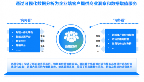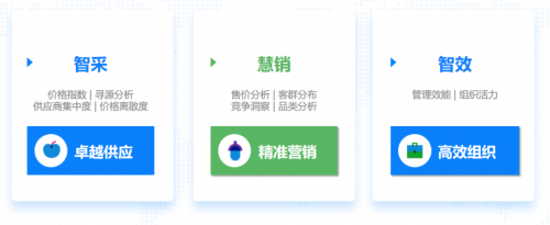 智采慧销一体化解决方案以智能数字化为起点,以智采、慧销、智效为三大功能板块,通过个性化的解决方案和精益运营的数据洞察,为企业端提供商业分析和数据增值服务,应用可视化的方式帮助企业了解经营管理现状并有效防控风险,从而实现卓越供应、精准营销、高效组织。