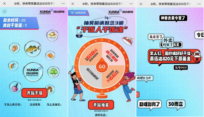 在本地微信公众号大V的强势引流下,“干饭人投喂计划”H5一经上线,就引发了网友们的广泛参与和转发。为赢得820元下厨基金,越来越多的网友自发分享寻找“饭友”助力,“一起干饭”从这一刻起不再是口号,更成了人们打破隔阂的社交行动。共鸣拉满的干饭宣言、简单但很上头的游戏,迅达以“投喂全网干饭人”为噱头完成了与用户的初步触达。抽奖赢迅达产品、进福利群还有红包雨惊喜,另一方面,迅达巧借游戏机制进一步达成了用户留存的目的,不仅提升了粉丝粘性和品牌好感度,还促进了游戏参与用户向品牌粉丝的转化。