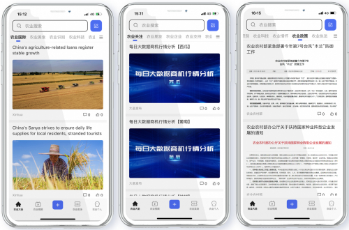 具体而言,资讯板块的建设遵循“人无我有、人有我全、人全我精、人精我专、人专我独”的原则,为用户提供农业关注、农业推荐、农业明星、农业国际、农业情怀、农业政策、农业执法等内容;农旅板块包含游记分享、旅行美食攻略、社交等方向的功能,为出游用户提供出行前中后各个方面的帮助;征信板块帮助用户对相关企业合作前景、投资前景及风险管理等方面进行科学预测;科技板块引入三维驾驶舱系统,为每个省份或每个品类的农品发展做具体画像分析,例如进行供需分析、种植预测及土壤监测等;搜索引擎提供站内、站外搜索,在信息服务的层面,聚合的是社会闲散资源,让闲散资源与服务得到精准的二次分配;互联板块包含农业朋友、农业支持、农业供应、农业需求、农业撮合、农业视频、农业问答等功能。