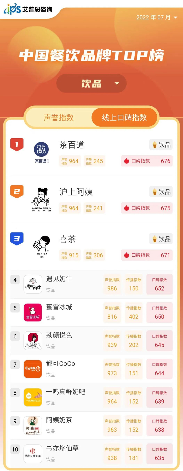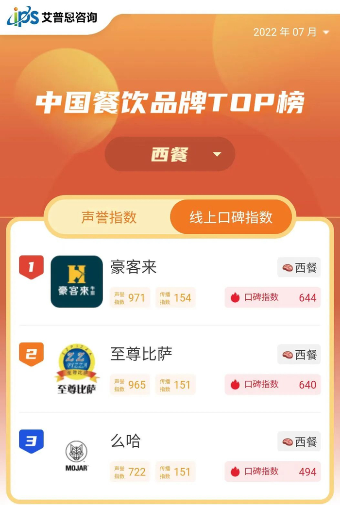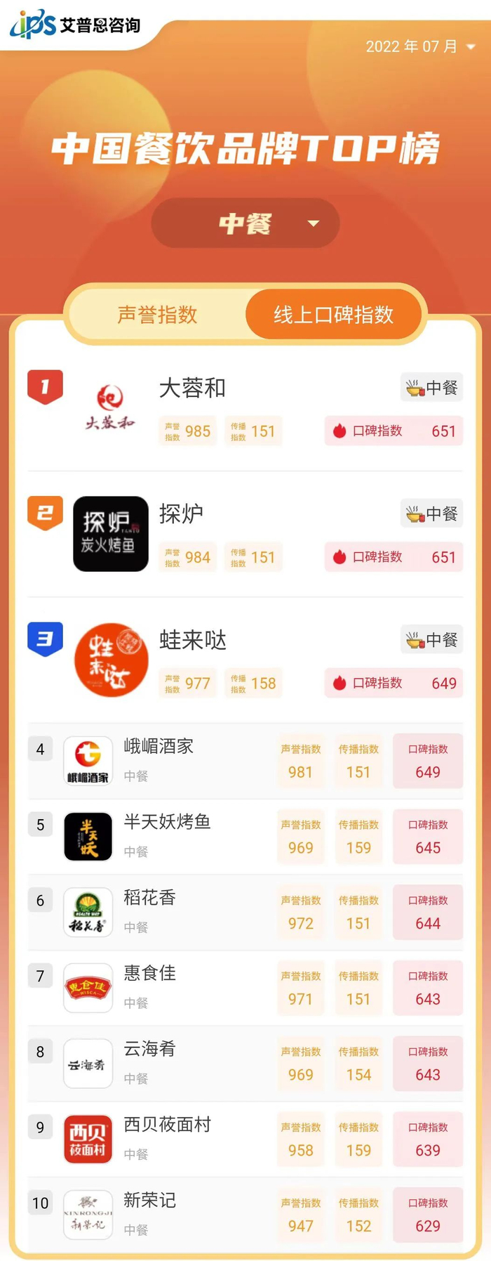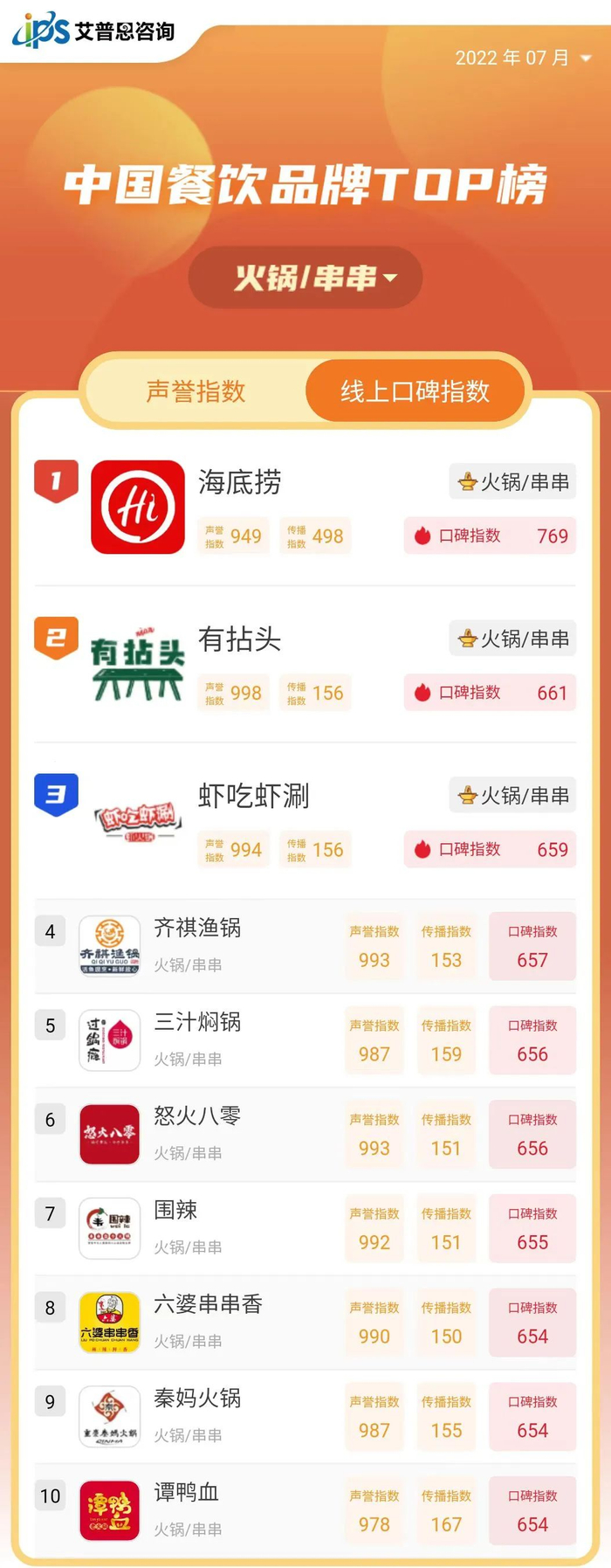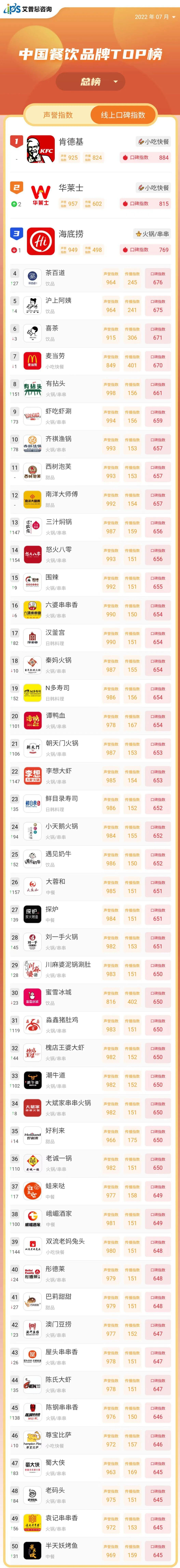 艾普思咨询:2022年07月中国餐饮品牌线上口碑指数TOP50