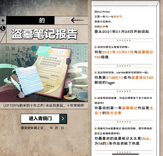 随此次线上稻米节,老福特还独家上线了《你的盗墓笔记报告》特色H5,超过17w名稻米在这里回顾在盗笔圈的印记。翻开盗笔报告,一键展开稻米的入坑点、与同好一起编织的记忆和投稿创作的历程,那些时光流淌而不褪色的回忆,LOFTER都记得,并为稻米们再次铺开。