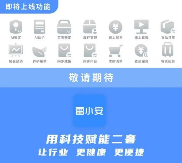 雷小安未来将致力于建立货品标准认证、经营管理标准、从业能力认证和信用标准认证等四大认证体系,并通过打造AI工具、SAAS工具、小安商学院和超级仓等工具或平台,建立行业鉴定、估价的标准,并通过商家工具、知识培训赋能行业商家,以标准化服务实现交易新体验,以技术化手段构建高端二奢生态链,最终打造值得信任的全球性供应链流通体系。