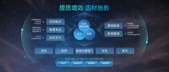 科大讯飞在“人工智能助力教育,因材施教成就梦想”理念指导下,通过人工智能核心技术加教育教学场景深度融合应用,为学生、教师以及各级教育管理者提供精准便捷的服务,构建了面向G/B/C三类客户的业务体系,从全局发力,帮助师生减负增效,促进教育进步。