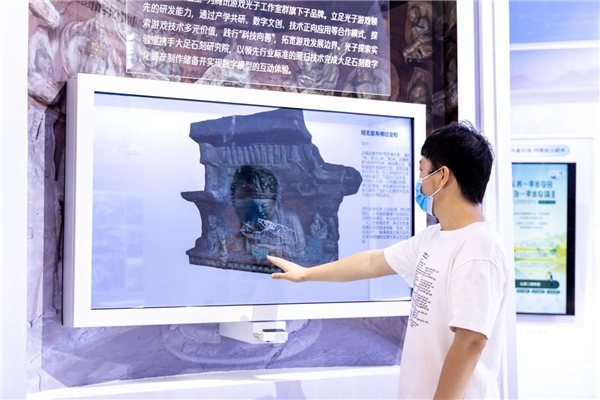 在腾讯光子探索实验室展台前,以领先行业标准的照扫技术完成的大足石刻数字模型,吸引着众多参观者驻足。参观者可以通过手势互动等装置,多角度与石刻造像互动,领略大足石刻的细节和高超的雕刻艺术。