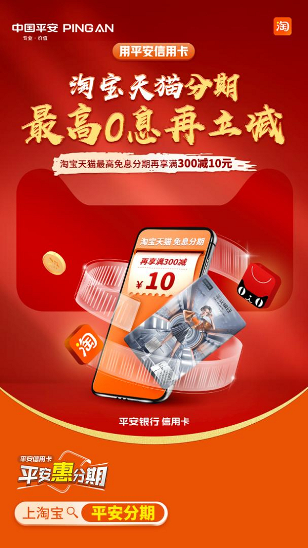 即日起至12月31日,在天猫、淘宝购物,收银台选择平安银行信用卡分期支付,有机会享受满300立减10元,每户每月限享1次。满300就能立减,活动持续到年底,每月都能减1次,算上这个月一共5次机会,那就是50元呀。