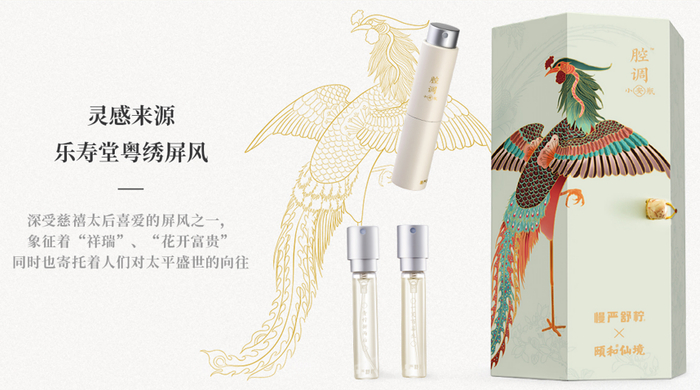 此次慢严舒柠和颐和仙境联名的这款「百鸟朝凤」口喷礼盒,源自颐和园内慈禧居所乐寿堂右侧的粤绣屏风,屏风上有 47 只、多个品种飞禽围绕在凤凰周边,体现着“百鸟朝凤”的寓意, 以此隐喻慈禧太后至高无上的地位。百鸟朝凤旧时用于喻指君主圣明,海晏河清,天下依附,后也比喻德高望重者众望所归。同时也表达人们对太平盛世的无限期盼。因此百鸟朝凤的图案纹样常见于绣品、家具、书画等上,传递和平、祈福之意。