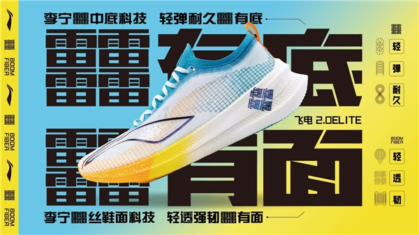 2022年上半年,李宁发布BOOM FIBER䨻丝鞋面科技,创造性地将䨻原材料应用于鞋面,通过先进的纺丝技术制备成轻质䨻丝,结合先进的编织技术,打造集轻质、透气、舒适于一体的鞋面。䨻丝鞋面科技的推出是䨻科技平台延伸升级的重要一步,标志着李宁䨻科技应用进入底面一体化时代。