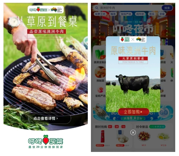 8月10日-17日,Meat & Livestock Australia(MLA)与叮咚买菜联合推出了「从草原到餐桌,原味澳洲牛肉」系列推广活动,推出了多款优质澳洲牛肉产品回馈消费者,并通过叮咚买菜APP开屏、弹窗以及首页信息流链接活动专题页的形式对澳洲牛肉产品进行全方位展示,让中国消费者更直观地感受到澳洲牛肉的天然、安全、优质和美味。