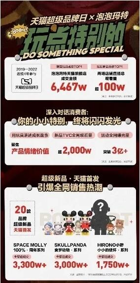 据了解,这是泡泡玛特第四次参加天猫超品日活动,已连续四年位居行业成交额榜首。在活动期间,泡泡玛特在天猫旗舰店进行了两场店铺直播,累计观看量超过100万。围绕本次超级品牌日“玩点特别的”这一主题,泡泡玛特以HIRONO小野为角色创作了动画短片,聚焦和放大产品的情绪价值,全网观看量超过2000万,全网曝光量突破3亿。