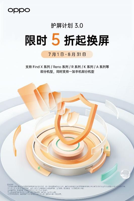 2022年7月1日-8月31日,OPPO针对消费者的实际用机痛点,于全球范围内推出了“护屏计划3.0”活动。活动涵盖了52款新老机型,OPPO手机用户可以通过官方享受低至五折的优惠活动和丰富的护屏内容。