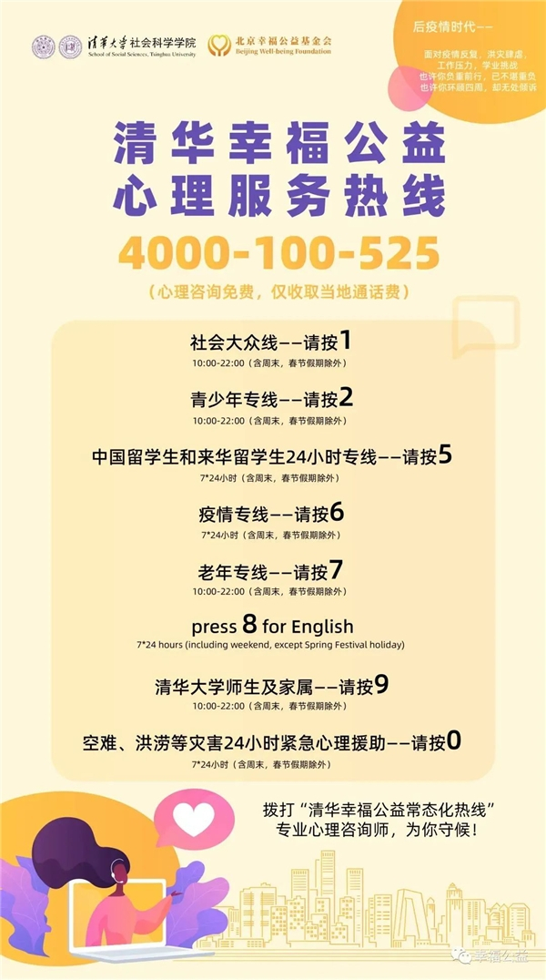 在清华大学心理学系和北京幸福公益基金会的全力组织与投入下,在全国心理学专家、 爱心机构和个人的大力支持下,“抗击疫情,心理援助”公益项目在服务规模、质量、可持续性方面,做出了积极的贡献。面对线上庞大的心理援助和咨询,热线无疑成为了幸福公益援助的最大保障。