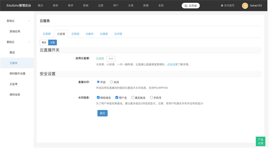 在当前盗版视频成本低获利高的背景下,无论是直播视频还是短视频都存在被盗版的风险,为保障教育机构的知识版权,阔知EduSoho研发了视频三重加密功能,不仅可以防下载防盗播,还可以针对盗录的情况,通过视频指纹识别盗录者的身份信息,进行溯源追责。并且课程直播可开启水印设置,教育机构能够自主选择显示网校域名、用户名、真实姓名和手机号,能方便版权所有人快速获取盗课的源头,并以此作为后续维权的证据。