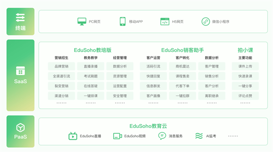 在这种背景下,阔知EduSoho作为一家专注职业教育赛道的数字化转型升级服务商,针对在线教学场景研发了一款直播产品——EduSoho直播,为教育机构提供了精品大班课、超级大班课、营销公开课、移动端直播等多样化的直播教学方式,帮助其在不同系统和场景打造集招生引流、课堂管理、督学互动、经营分析等核心功能为一体的教学直播平台。