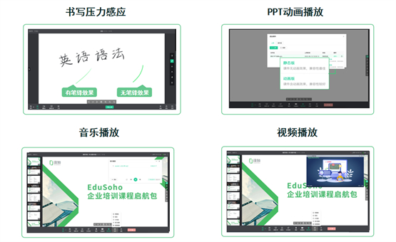 据了解,EduSoho直播支持高清视频、音频、PPT课件、电子白板及屏幕共享等多种教学方式,满足课件讲解、视频演示、桌面软件演示等不同教学场景。讲师在具体操作时,可结合实际需要选择不同模式的线上课程。在一堂直播课中,系统还允许多个课件组合式教学,丰富教学形式,提升学习效率。