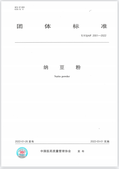 同时,峰会现场正式发布了由中国医药质量管理协会、广东双骏生物科技有限公司牵头,联合沈阳药科大学等15家科研院所和企业参与起草的团体标准T/CQAP2001-2022《纳豆粉》。
