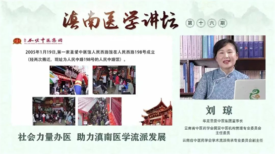 为助推滇南医学流派建设,为中医学派发展贡献社会力量,8月9日晚华龙圣爱中医集团董事长、云南省中医药学会民营中医机构管理专业委员会主任委员、云南省中医药学会学术流派传承专业委员会副主任刘琼女士做客《滇南医学讲坛》直播间,为大家分享《圣爱中医馆中医学术流派建设实践经验分享》,当晚众多中医行业领导者、中医学术流派门人弟子、中医药从业者等进入直播间与刘琼董事长互动对话,共赴一场“学习盛宴”。