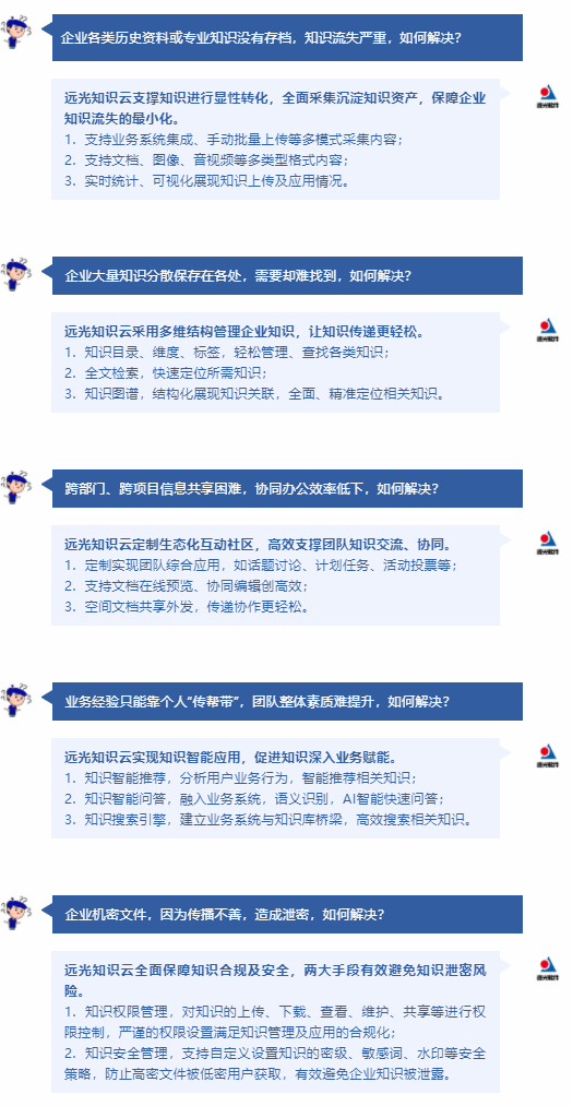 对于企业知识管理场景中常见的难题,远光知识云提供以下解决方案,全面支撑企业知识高效、安全管理与应用。