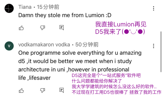近两年圈子里说起3d渲染软件,D5渲染器“国产之光”的形象已经深入人心,也能不断看到大批建筑、设计师试水投产。支持国产的心态固然存在,但对于提升生产力的追求才是转换根本。作为一款“墙内墙外两开花”的软件,D5渲染器不仅在国内有着极高的讨论度,海外平台上也收割一众好评,其中不乏Lumiom、V-Ray、Twinmotion等老牌渲染器的长期用户。