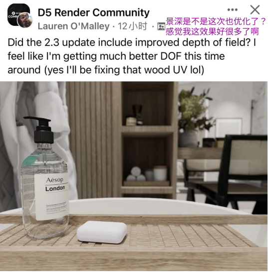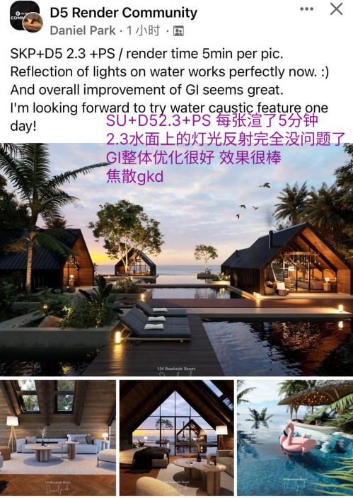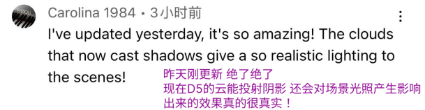 以上几点只是冰山一角,D5 2.3新增与优化更新点共53项,从渲染效果、操作交互、线上素材等角度切入,满足用户不同需求。目前来看,好评一片: