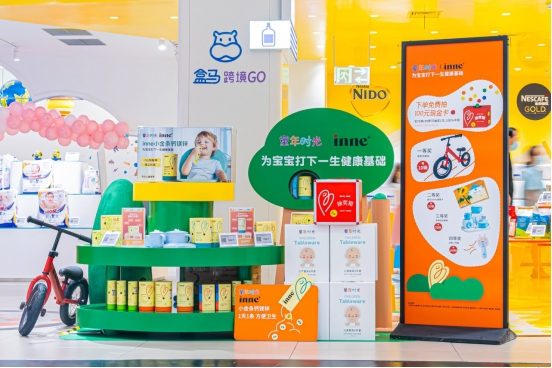 消费者一踏入盒马跨境GO的母婴专区,童年时光inne的展牌就引入眼帘。产品展架以绿树为原型,旨在如参天大树般为宝宝的茁壮成长提供安全保障。
