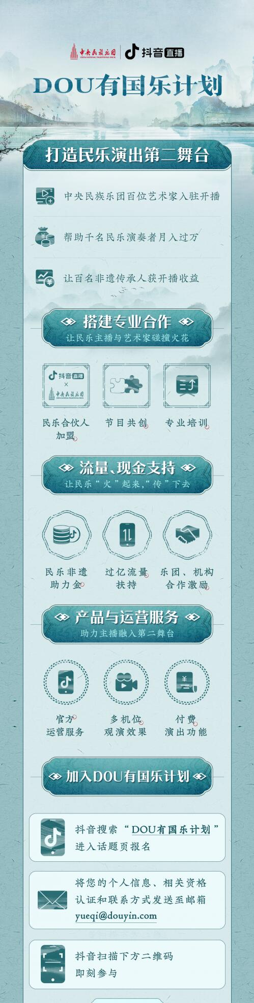 “DOU有国乐”计划负责人石敏介绍,接下来,抖音直播将围绕以下四个方面帮助民乐演奏者获得新收入:抖音直播将投入过亿流量,帮助民乐新人主播成长,扶持民乐专业演奏者、民乐乐团;同时,抖音直播还计划建立更多专业领域的合作;第三,为民乐主播提供官方运营服务、培训指导,对直播间打造、直播内容与技巧等进行培训指导;最后,推出付费演出、多机位同步播放等产品能力,帮助民乐行业实现线上多元化经营。目前,在抖音搜索“DOU有国乐计划”找到相关话题,即可参与报名。