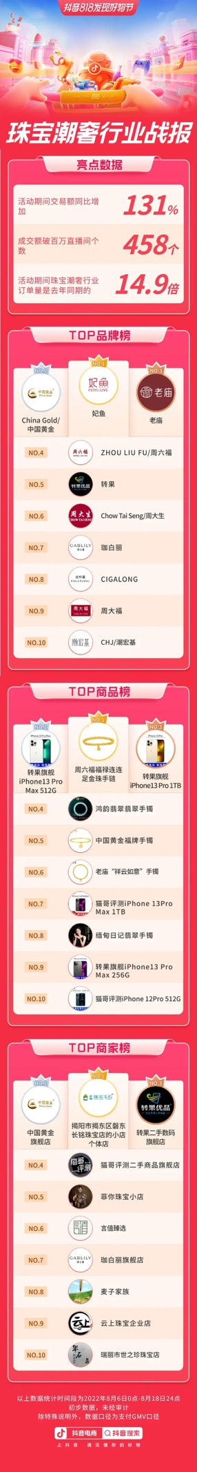 此次抖音818发现好物节期间,珠宝潮奢行业的品牌、商家都取得了不俗的成绩。