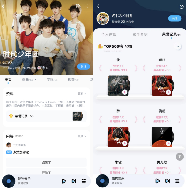时代少年团作为有一定影响力的公众团体,坚持用高质量的舞台和作品向观众传递积极的新青年形象。用音乐让丰富多元的传统文化元素焕发光彩,为广大粉丝群体带去不断向上的勇气与力量。目前在酷狗音乐,他们的歌曲已有超过9111万人收听,《侠》、《傻瓜》、《男儿歌》等多首歌曲都曾登顶酷狗TOP500榜榜首,这足以见得他们的音乐在年轻网友中的欢迎程度,也让大众看到国风的无尽魅力与潮流。