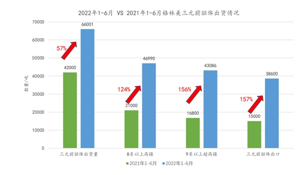 2022上半年,动力电池用三元前驱体材料出货量达到66,001吨,位居世界前二,同比大幅增长57%,贡献营收75.18亿元,同比增长达147.82%。其中8系及以上高镍产品出货量46,990吨,占出货总量的71%;9系超高镍(Ni90及以上)产品出货量43,086吨,占出货总量的近65%,位居世界前列,标志公司全面实施三元前驱体材料向8系及8系以上高镍产品的升级,并全面导向以9系超高镍为主导的高技术产品制造,成效显著。同时,出口38,600吨,同比增长超过157%,占总出货数量的58.5%,标志公司三元前驱体产品的全面国际化。