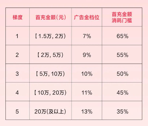 参与此次活动,在小红书开通广告投放账户后,企业须得在资质审核通过后7天内充值。根据首充金额档位,获得对应档位广告金,企业充值金额上限为20万元,如充值金额超过20万元,均以20万元计算广告金及消耗门槛。