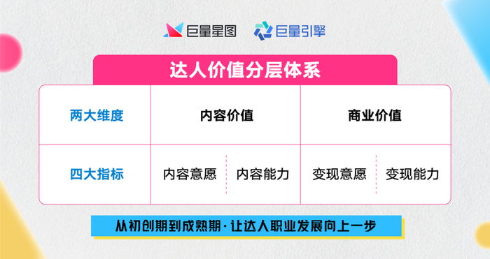为科学助力达人长期职业发展,巨量星图推出了一套全新的「达人价值分层体系」,从两大维度、四大指标,帮助处于不同阶段的达人实现确定性成长和跃迁。