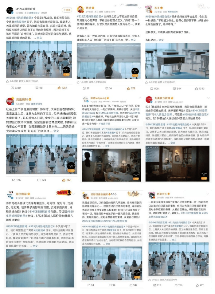 525当天,视频微博话题#525支持妈妈爱自己#冲上热搜,嫚熙与奇葩说知名辩手傅首尔、作家苏芩等明星大V,visit看天下、三联生活周刊、广州日报、凤凰周刊等知名媒体,以及丸美、滋源等知名品牌进行对话,探讨如何支持妈妈爱自己。知名自媒体公众号“新世相”、“民生周刊”、KOL“陈大奔儿er”、“广式老吴”等也发文响应嫚熙为母亲“解绑”减负的呼吁。在KOL和网友们的互动下,嫚熙倍具关怀温度的品牌形象也随着话题不断扩散,让更多人看见。